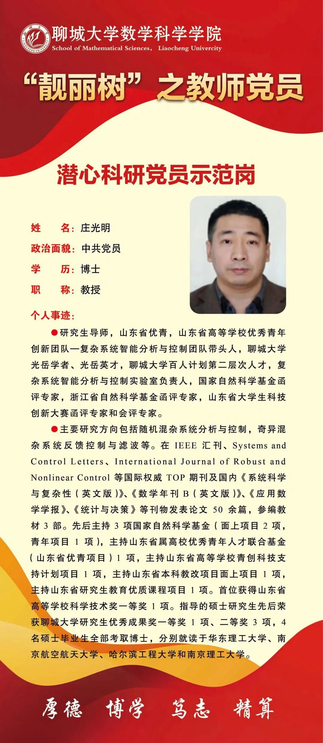 “靓丽树” | 亮出党员身份 争做先进标杆——潜心科研党员示范岗 发布时间: 2022-11-08 为进一步发挥党员先锋模范作用,强化党员意识,铭记党员身份,履行党员义务。数学科学学院开展了以“亮党员身份、立先进标杆、树先锋形象”为主要内容的“靓丽树”活动,激励全体党员在新的奋进之路上,勇于担当、锐意进取、干事创业、攻坚克难,以接力跑的姿态带领全院师生紧握时代赋予的“接力棒”,锚定前进方向,笃定前行速度,铆足实干动力,在新赛道上奋力奔跑出数学“加速度”。