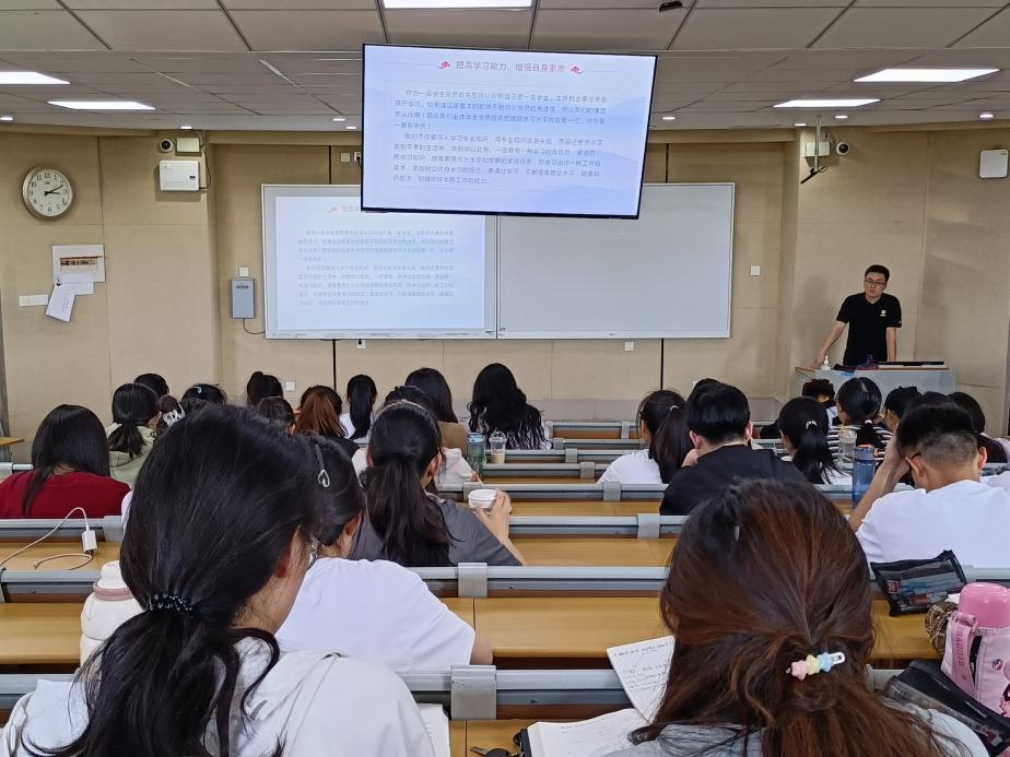 在本次党课中,姚三乐以“争做新时代有为的大学生党员”为主题,分别从“坚定理想信念,提高政治素养”、“提高学习能力,增强自身素质”、“发挥先锋作用,提高工作能力”和“加强群众联系,发挥纽带作用”四个方面对党员应具备的基本素养进行详细的讲述,他提出,当代大学生应不断提高政治理论修养,坚定理想信念,积极学习党内知识和当前国家时事,并将理论知识应用于实际行动中去。丁春晓以“学深悟透增本领,担当作为重实效”为主题,结合自身经历,为同学们分享了大学生应如何在大学中苦练扎实本领,怎样设立人生目标并逐步实现目标等实践问题。