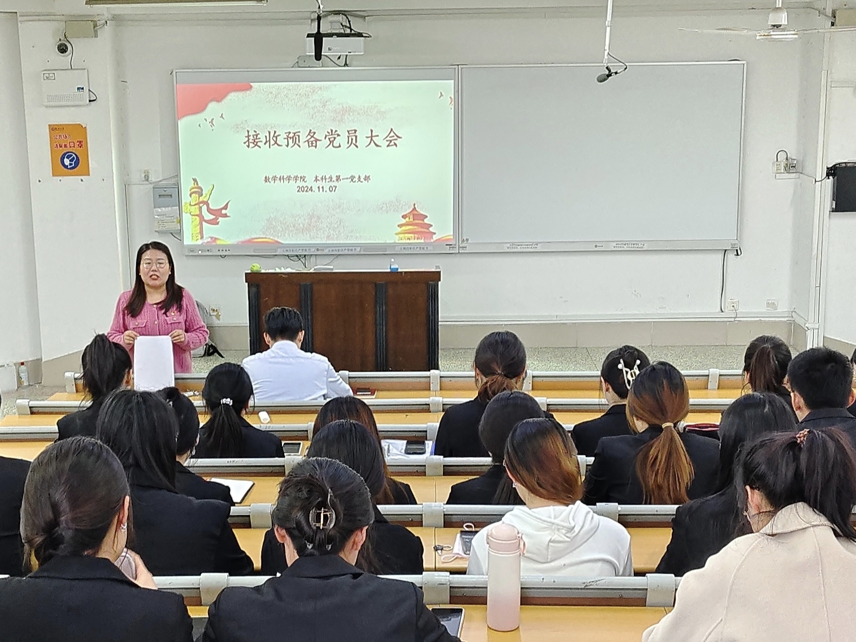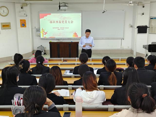 为加强党支部自身建设,推动党的各项工作有效开展,11月7日,数学科学学院本科生第一党支部于11号教学楼C204教室召开接收预备党员大会,会议由第一党支部书记岳琳琳主持,支部全体党员参加。