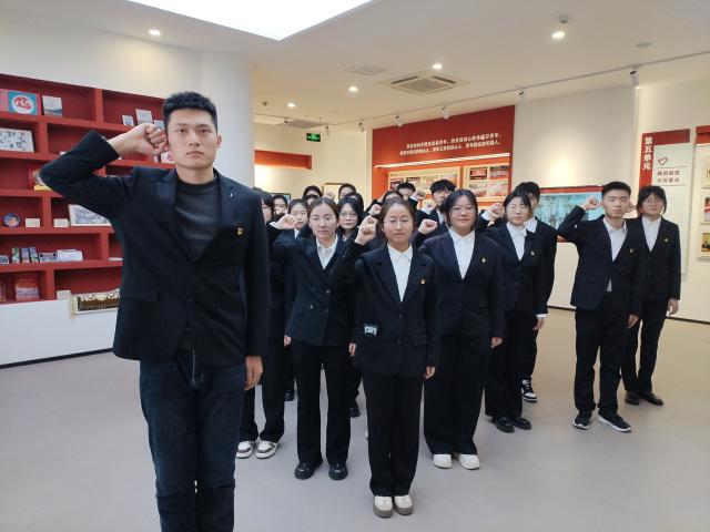 在庄严肃穆的氛围中,全体党员整齐列队,他们面向党旗,右手握拳过肩,神情庄重而坚定,面向鲜红的党旗郑重宣誓。在领誓人姜雨辰的带领下,一句句铿锵有力的誓言响彻全场,高喊着为共产主义事业奋斗终身的决心。