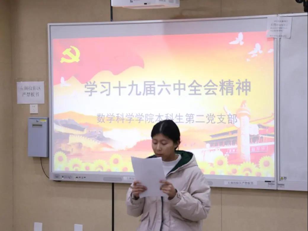 最后,本科生第二党支部推选出两名党支部成员唐明银、丁文秀分享在本次会议中的心得体会。她们表示我们要想将党的十九届六中全会精神学懂、做实,就要争做习近平新时代中国特色社会主义思想的实践者和传播者,用专业服务社会,把青春献给祖国,并得到了党支部成员的一致赞同。
