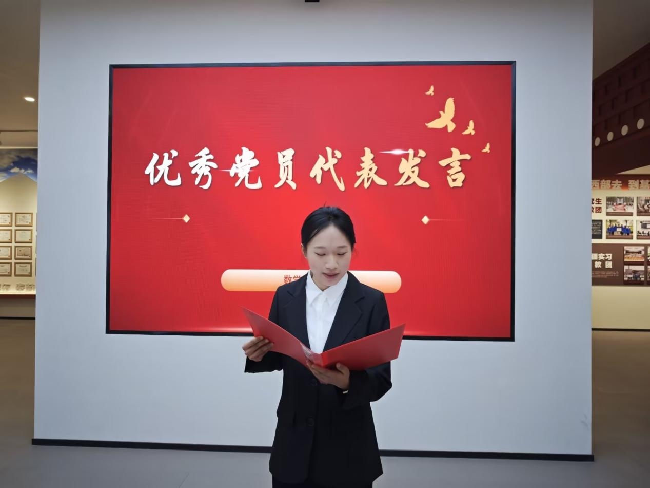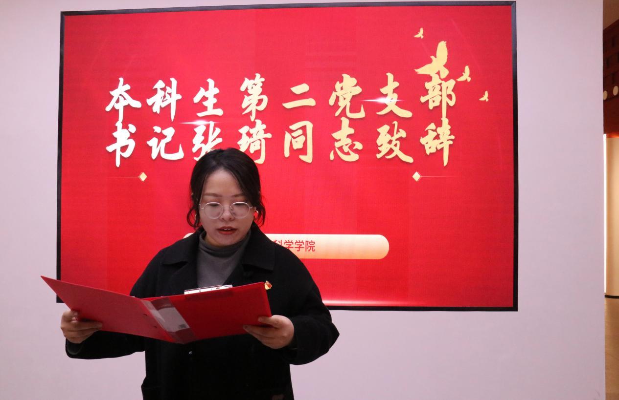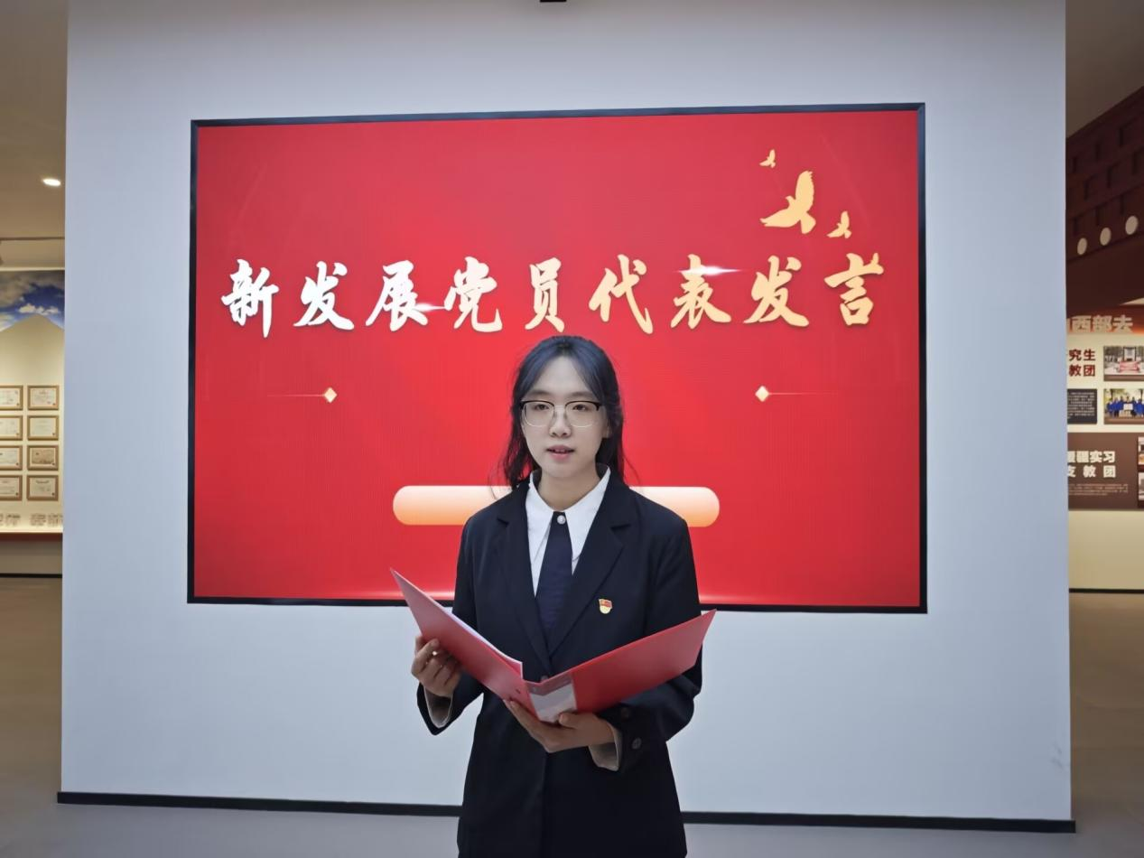 新发展党员代表张睿琳同志进行了表态发言:一是铭记誓言,筑牢信仰之基,持续加强理论学习;二是知行合一,练就过硬本领,以真才实学践行“强国有我”的青春誓言;三是示范引领,践行初心使命,在班级工作、学生活动、志愿服务中主动担当、积极作为。