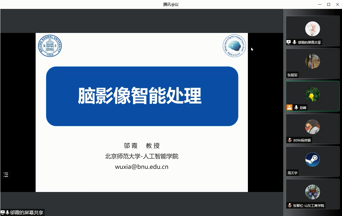 2022年4月22日(星期五)下午14:30,受海角 智能数据分析团队邀请,北京师范大学邬霞教授在线上做了关于脑影像智能处理的学术报告,本次报告以腾讯会议的形式举行,由乔立山教授主持,数学科学学院部分教师、研究生聆听了报告。