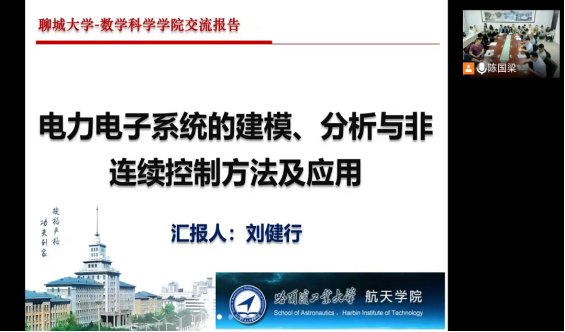2022年5月6日(星期五)晚上19:00-21:00,受海角 复杂系统智能分析与控制团队邀请,哈尔滨工业大学刘健行教授在线上做了关于电力电子系统的建模、分析及非连续控制方法、论文写作以及国家自然科学基金申请体会的报告。本次报告以腾讯会议的形式举行,由陈国梁老师主持,数学科学学院部分教师、研究生聆听了报告。