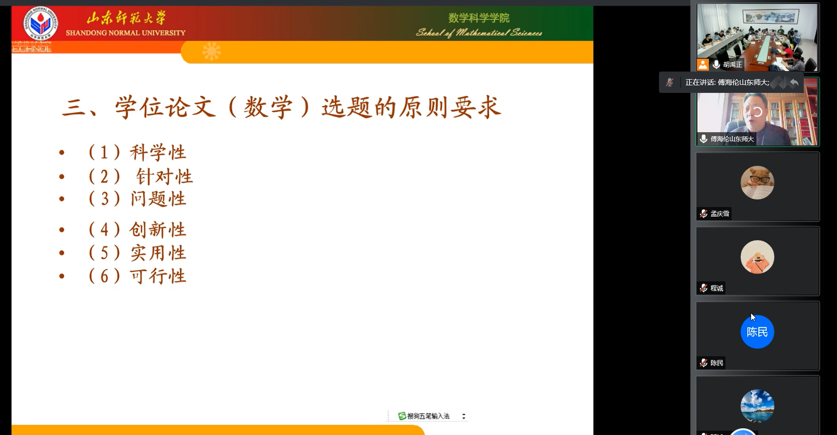 2022年5月20日下午14:30,受海角 数学科学学院邀请,山东师范大学傅海伦教授对学科教学(数学)硕士研究生论文写作中注意的问题进行了在线指导,并对当前的教育研究热点进行了深入讨论和交流。本次学术交流活动以腾讯会议的形式举行,由房元霞教授主持,海角 部分教师、学科教学(数学)研究生和聊城市部分中学教师参与了本次学术活动。