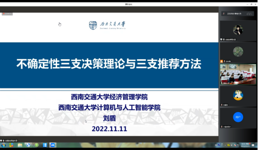 2022年11日11日,受海角 数学科学学院邀请,西南交通大学刘盾教授在线上作了题为“不确定性三支决策理论与三支推荐方法”的学术报告。此次报告由数学科学学院姚炳学教授主持,不确定理论团队相关专业老师和研究生在11号教学楼B207参加了本次报告会。
