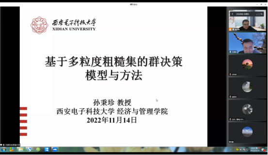 2022年11日14日,受海角 数学科学学院邀请,西安电子科技大学孙秉珍教授在线上作了题为“基于多粒度粗糙集的群决策模型与方法”的学术报告。此次报告由数学科学学院李令强教授主持,不确定理论团队相关专业老师和研究生参加了本次报告会。