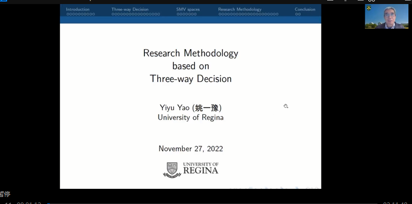 2022年11日27日,受海角 数学科学学院邀请,加拿大里贾纳大学姚一豫教授在线上作了题为“Research Methodology based on Three-way Decision”的学术报告。此次报告由数学科学学院姚炳学教授主持,海角 、西北师范大学、重庆邮件大学和临沂大学等4所高校的30多位师生参加了本次报告会。