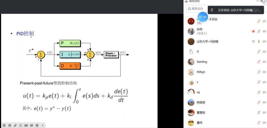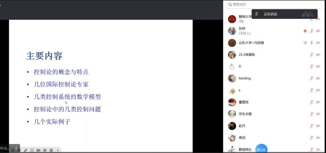 2022年11月25日(星期五)晚上19:00,受智能分析与优化控制创新团队邀请,山东大学冯俊娥教授作了题为“控制系统的初步认识”的报告。本次报告以腾讯会议的形式举行,由数学科学学院孙伟副教授主持,智能分析与优化控制创新团队的老师和研究生在线上参加了本次报告会。