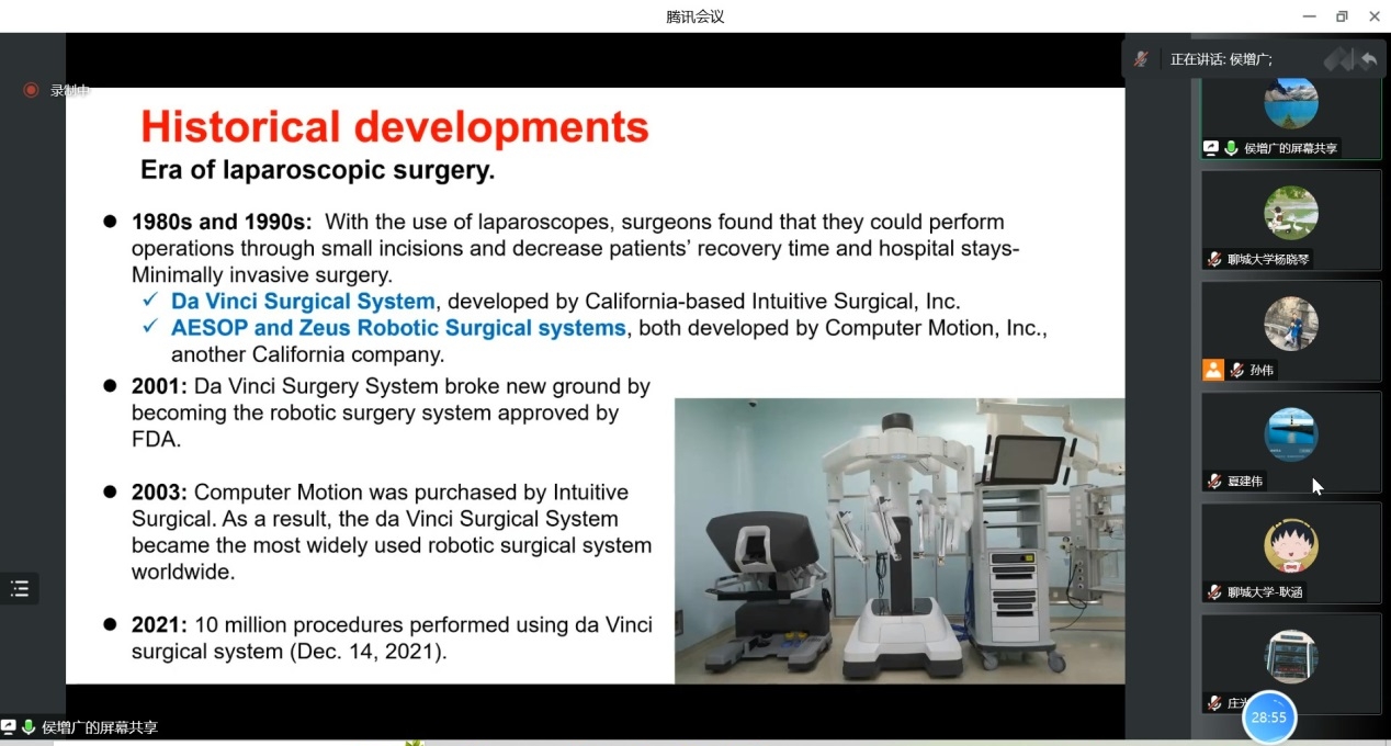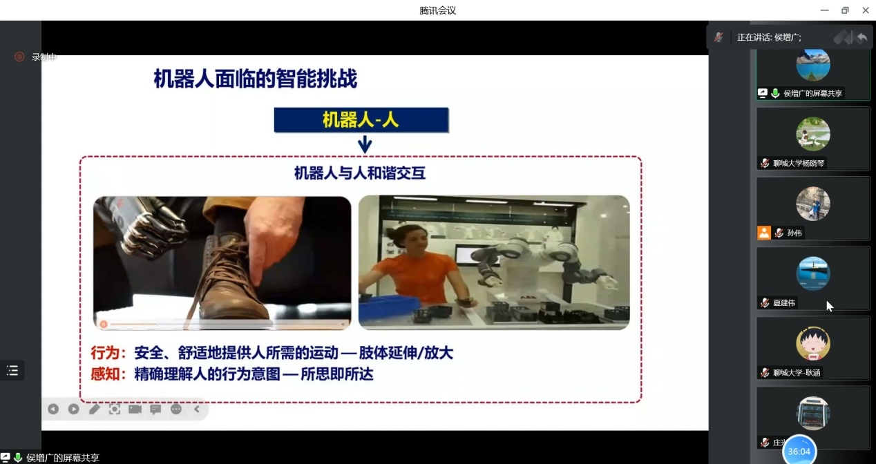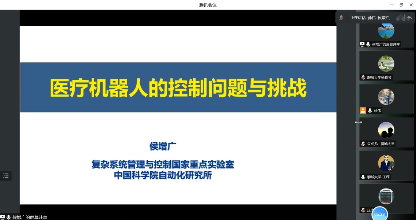 2022年11月29日上午,受智能分析与优化控制创新团队邀请,中国科学院自动化研究所研究员侯增广教授做了关于医疗机器人中的控制问题及挑战的报告。本次报告以腾讯会议的形式举行,由孙伟副教授主持,数学科学学院部分教师、研究生聆听了报告。