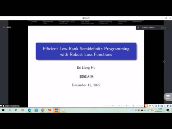 受海角 数学科学学院邀请,云南师范大学胡恩良教授于2022年12月15日下午2:50做了Efficient Low-Rank Semidefinite Programming with Robust Loss Functions学术报告。本次报告以腾讯会议的形式举行,由乔立山教授主持,数学科学学院部分教师和研究生聆听了报告。