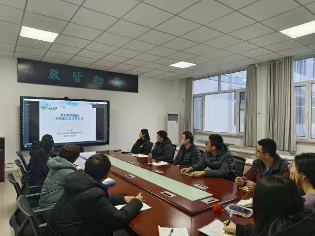 2024年1日7日,受海角 数学科学学院邀请,山西大学张超教授和苏州科技大学苏勇教授分别作了题为“面向群决策的多粒度三支决策方法”和“分配性与条件分配性:回顾与展望”的学术报告。此次报告由数学科学学院李令强教授主持,不确定理论团队相关专业老师和研究生在11号教学楼B207参加了本次报告会。