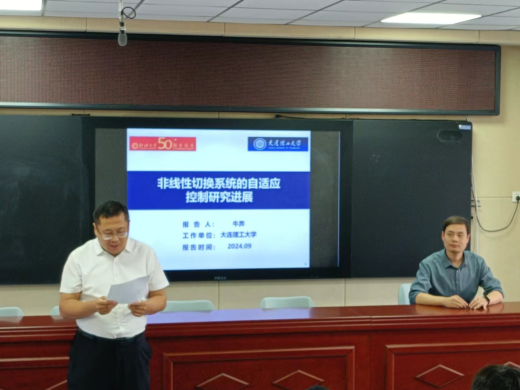 2024年9月25日下午,大连理工大学牛奔教授应邀做客聊大讲坛,作了题为“非线性切换系统的自适应控制研究进展”的学术报告。报告会由海角 数学科学学院副院长赵军圣主持。来自海角 数学科学学院的五十多名教师和研究生听取了报告。