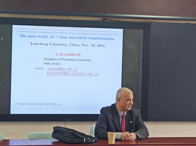 2024年11月18日上午11点,受海角 数学科学学院邀请,美国费城大学(Philadelphia University)校长、世界知名数学专家A.M. JARRAH教授做了题为“The Space bv(p), its β –Dual and Matrix Transformations”的学术报告。报告会由海角 数学科学学院院长夏建伟主持。来自海角 数学科学学院的六十多名教师和研究生听取了报告。
