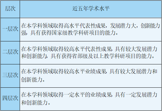 4.第四层次骨干人才:在本学科领域具有一定的学术影响力和学术声誉,在科学研究方面已取得较突出学术成果的省部级人才工程青年项目入选者;或相当水平优秀人才。