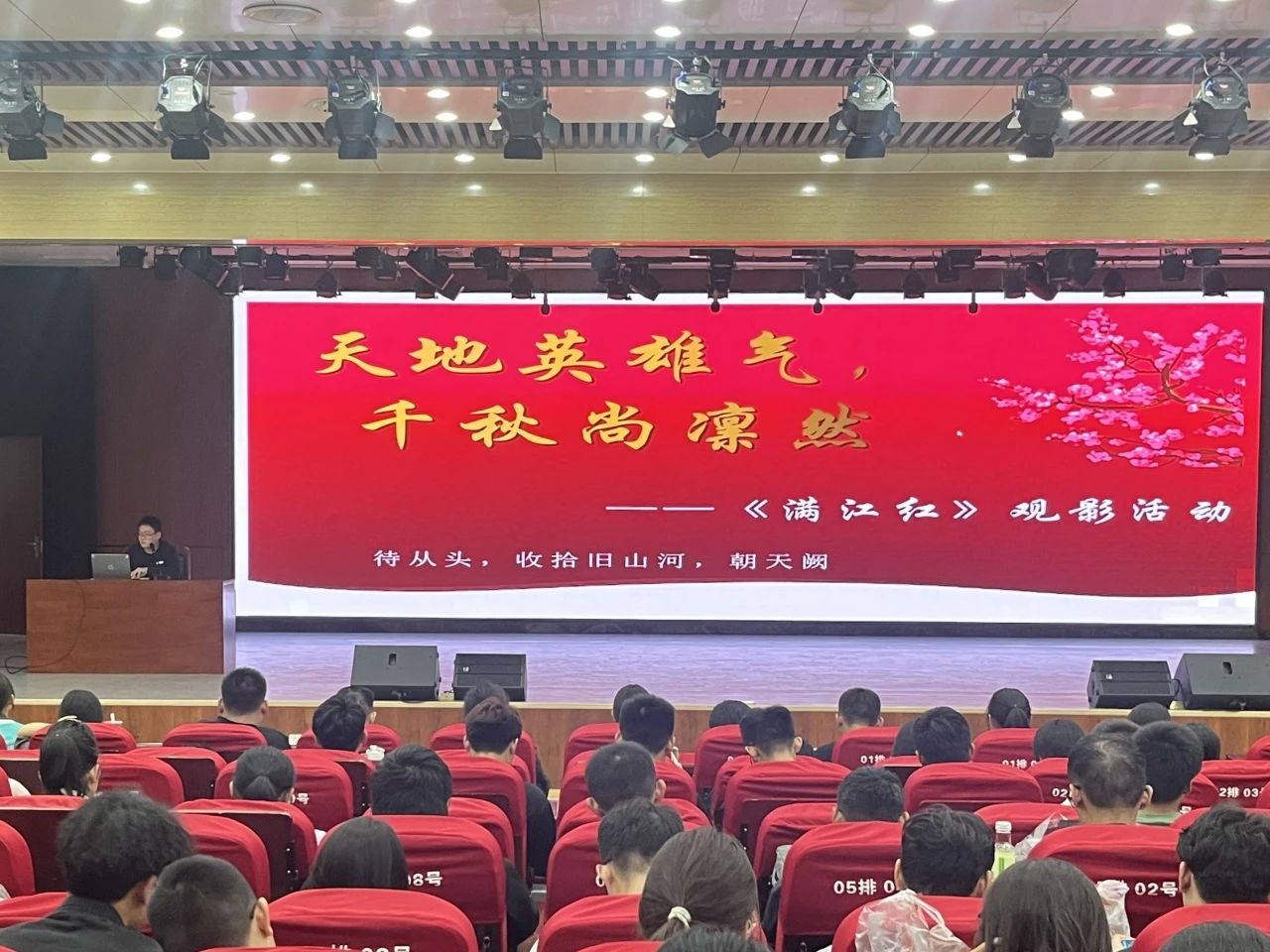 观影开始前,姚三乐向同学们介绍了电影《满江红》的历史背景,深刻剖析了岳飞精神的丰富内涵,并鼓励同学们从岳飞精神中汲取奋发前进的精神力量,将个人青春梦融入伟大中国梦,敢于担当、勇于奋斗、志存高远、忠于祖国,努力做新时代具有远大理想和坚定信念的爱国者。影片《满江红》以著名爱国将领岳飞精忠报国、壮志未酬的家国情怀为背景,用全新的视角刻画了一群奋勇向前、舍生取义、保家卫国、可歌可泣的有志之士,在跌宕起伏的情节中彰显出了崇高的爱国主义精神。片尾全军复诵《满江红》更是将现场氛围推向了高潮,再次引起了同学们对历史的共情、对祖国的共鸣。