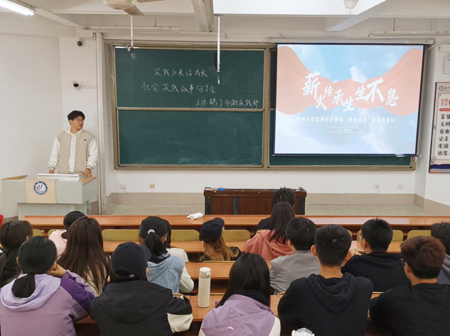 10月15日,数学科学学院于11号教学楼A104教室举办“实践归来话成长”社会实践故事分享会。本次分享会邀请了“青鸟计划”参与者牛文烁、“重走繁森路,再续西域情”社会实践队成员刘琪和“薪火传承”志愿服务队成员董杰群主讲,2022级、2023级部分同学参加。