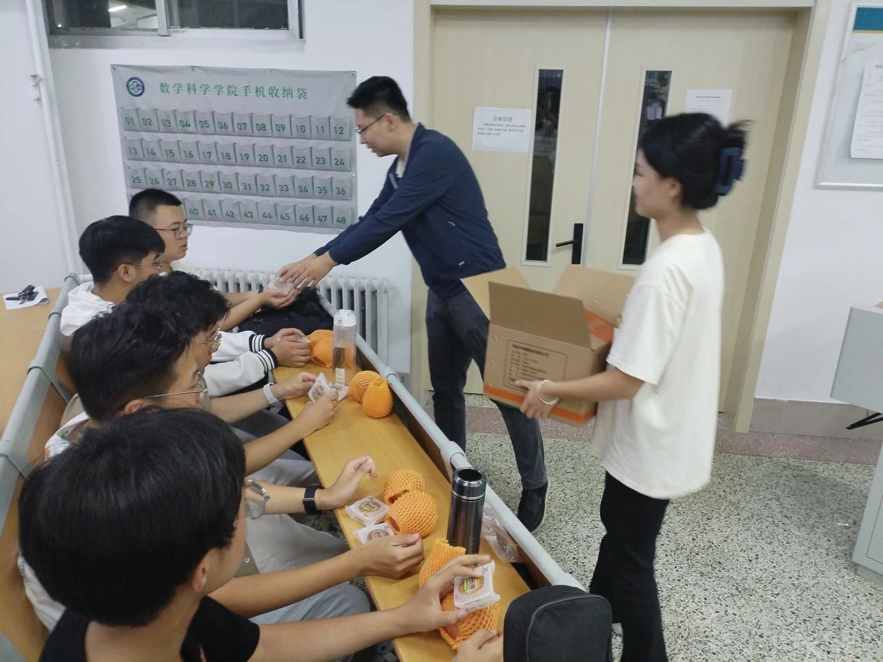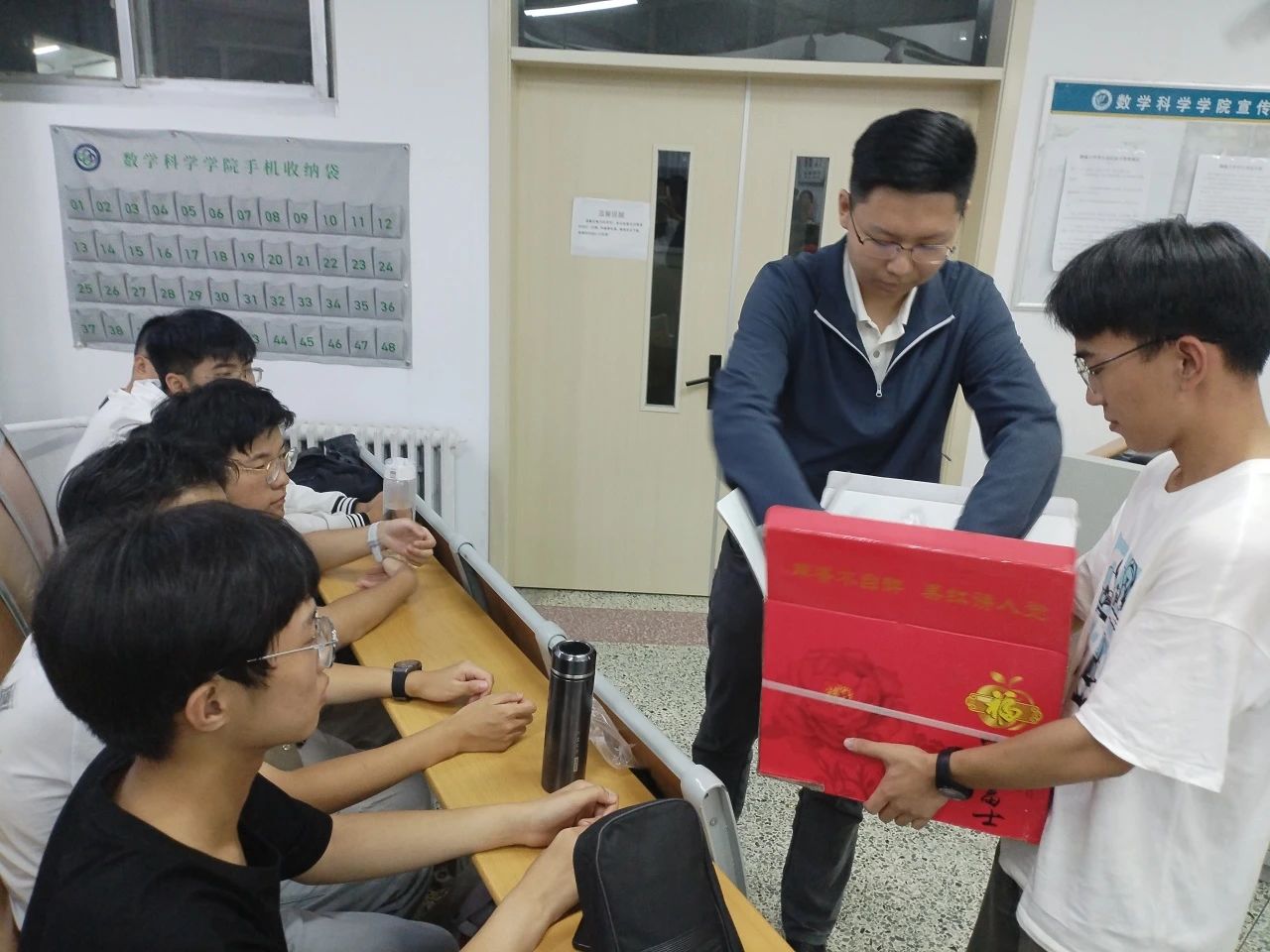 月满中秋,情满数科。为热烈欢迎新同学的到来,营造中秋佳节的浓厚节日氛围,让身在异乡的学子感受到来自数科大家庭的关怀与温暖,9月17日,数学科学学院辅导员王启尧、张琦于11号教学楼A204、A207、A210为新生送上中秋月饼和节日祝福。