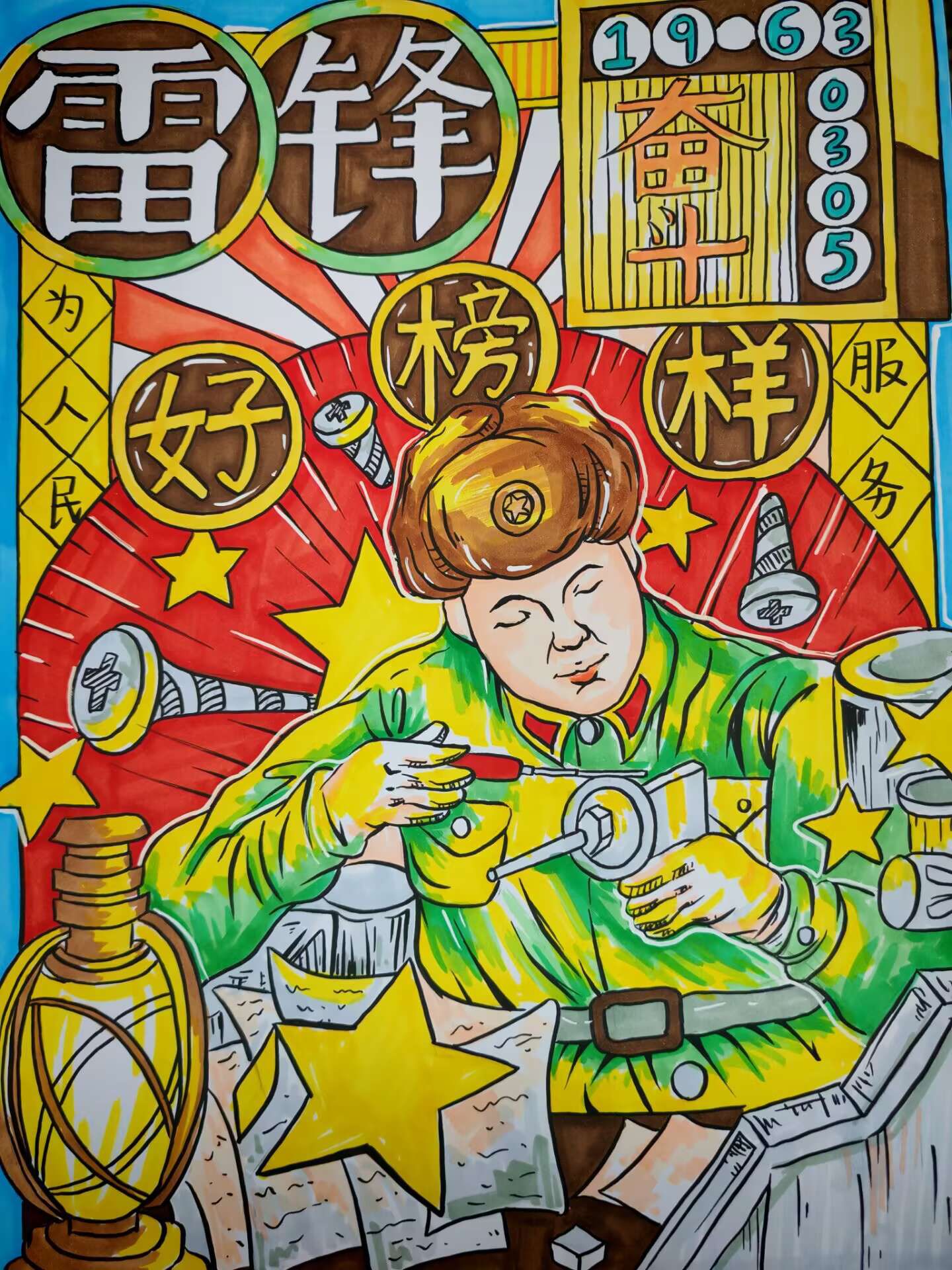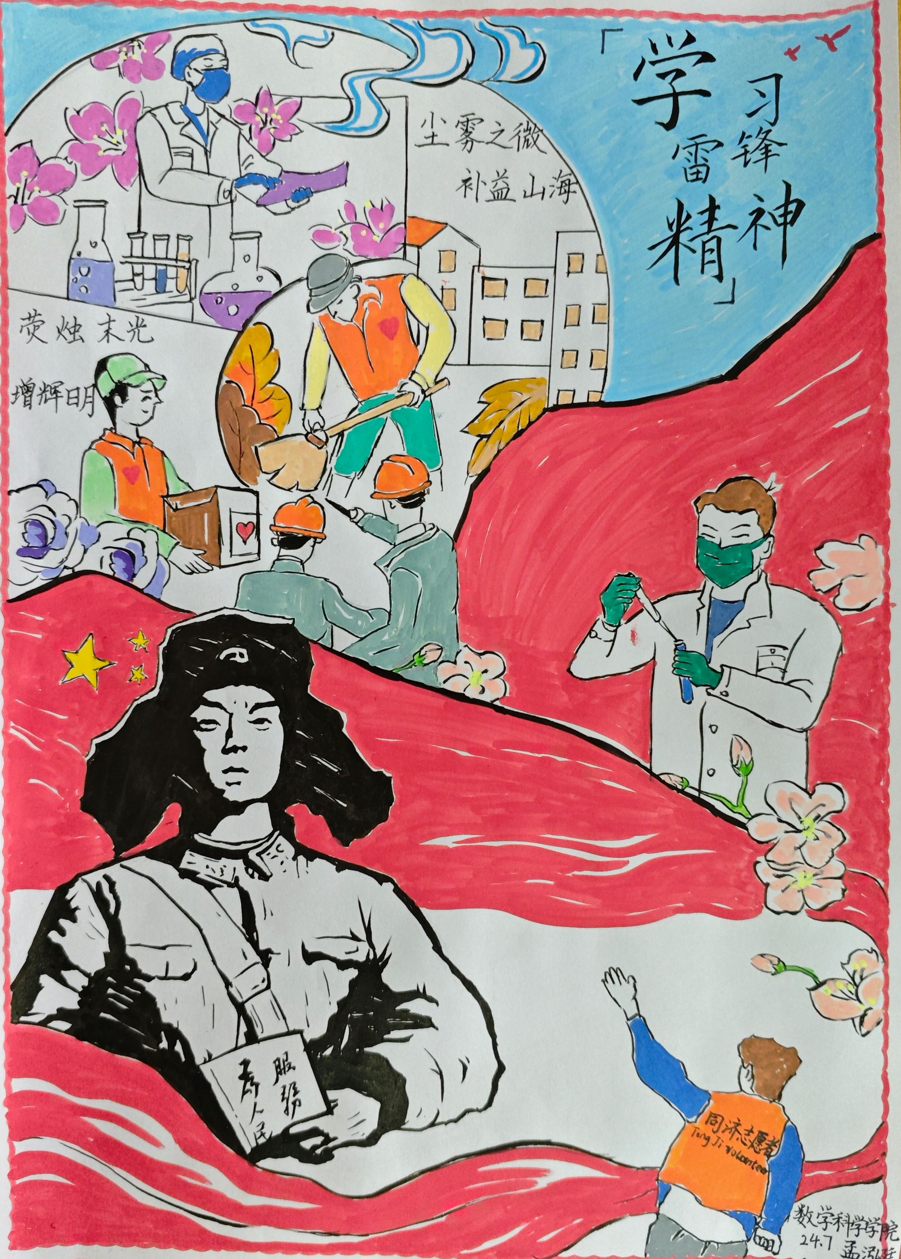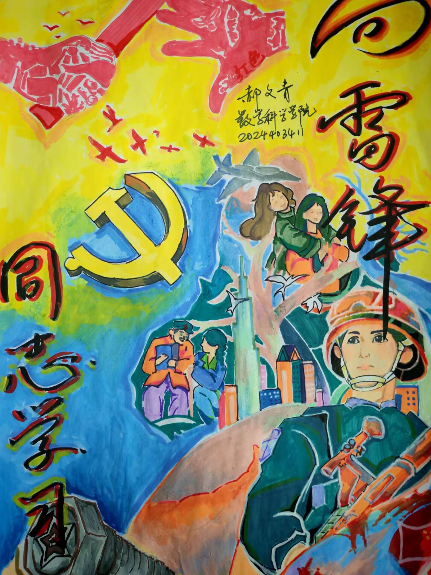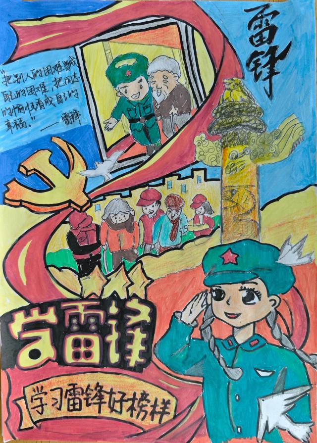 参赛者们首先观看了一段生动感人的视频,全面展现了雷锋的成长历程、感人事迹以及他在平凡生活中所践行的无私奉献精神,使同学们更加直观且深刻地感受到雷锋精神的深厚内涵。视频中的画面不仅勾勒出雷锋平凡而伟大的一生,更激发了参赛者们对雷锋精神的共鸣与思考。参赛者们依次展示自己精心创作的海报作品,并相互交流设计理念与创作心得。这些作品以雷锋的肖像为核心,融入生动的场景描绘,通过丰富的色彩、巧妙的构图与富有象征意义的元素,深刻诠释了雷锋精神的时代价值,传递了助人为乐、无私奉献的精神风貌。每一幅作品都凝聚了同学们的独特创意与深刻理解,主题鲜明、构思精巧,展现了青年一代对雷锋精神的创新表达与时代传承。