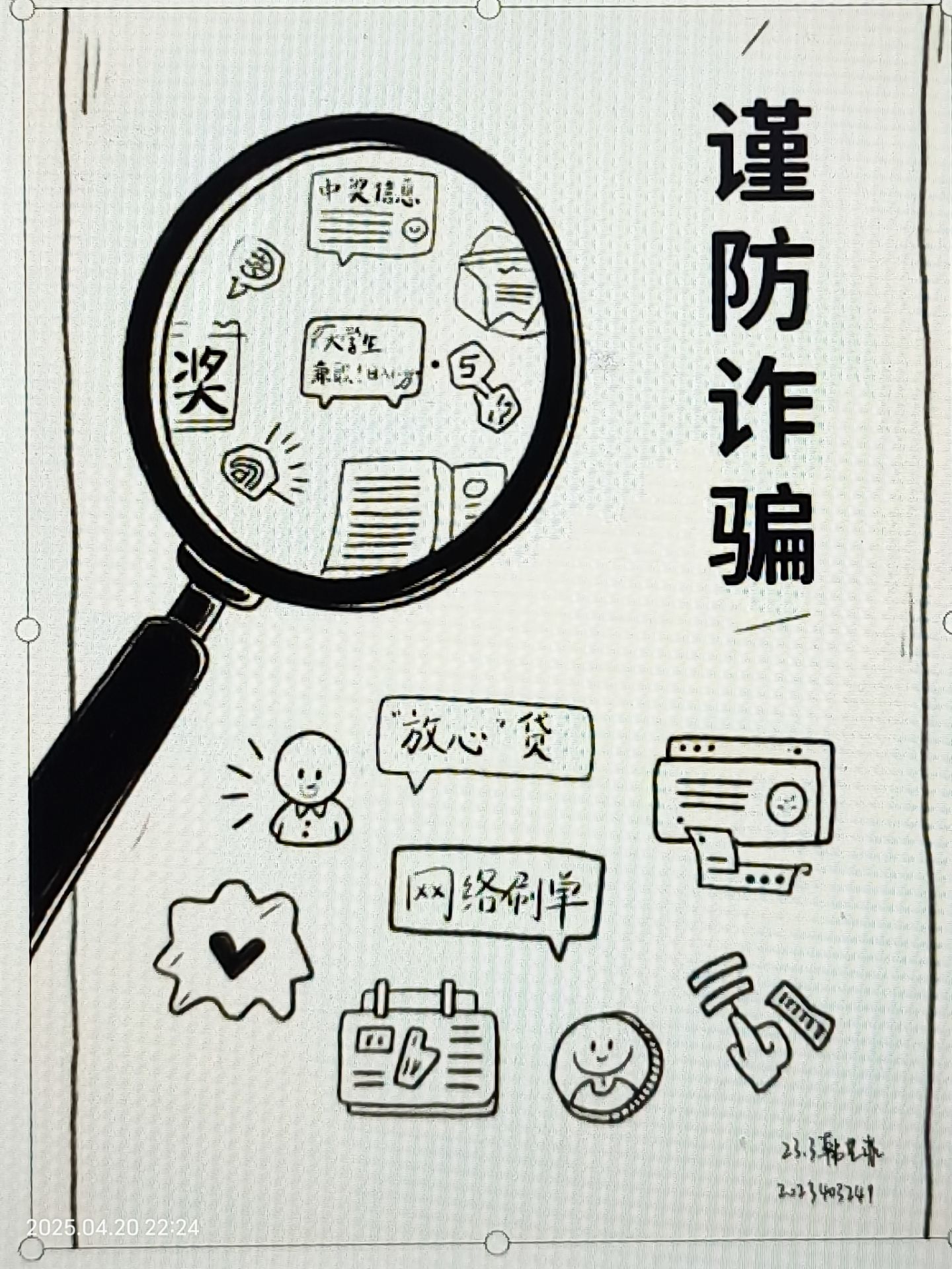 经过学院筛选,最终选出四部优秀作品。2023级3班韩艺菲同学的海报以简洁有力的视觉元素传递反诈信息。醒目的“谨防诈骗”大字体,直接点明主题;“中奖消息”“放心贷”“网络刷单”等诈骗关键词,清晰指出常见诈骗类型;电脑屏幕、手机界面等图形元素,生动呈现诈骗发生的网络场景。该作品旨在通过直观的视觉冲击,让大家快速识别网络诈骗类型,提高防范意识。