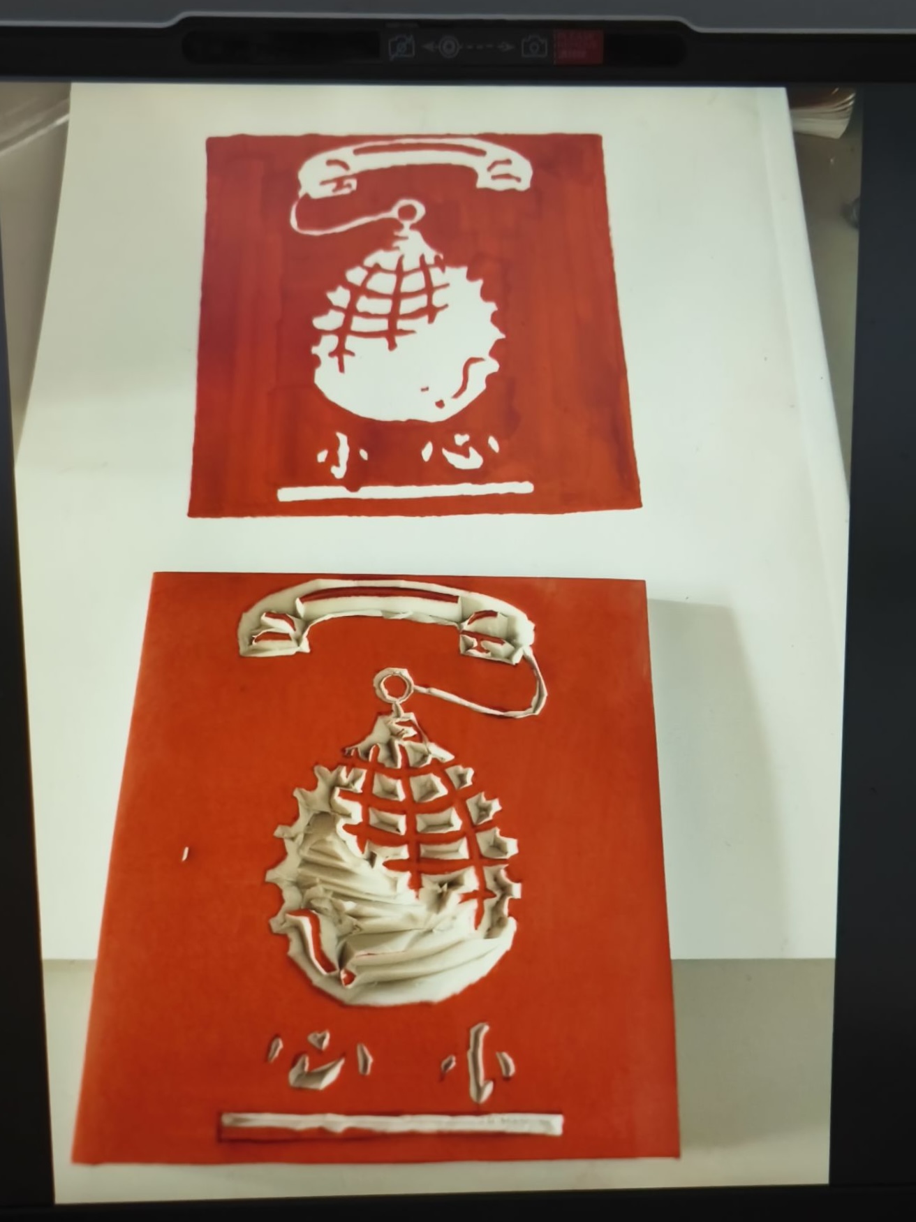 2024级4班刁新颖同学带来的作品——反诈宣传橡皮章,构思巧妙。她将电话线与炸弹相连,电话线作为日常通讯工具,却常被诈骗分子利用,炸弹则象征诈骗带来的危害,下方“小心”二字更是直白警示。这件作品宛如反诈小卫士,提醒人们在享受通讯便利时,时刻警惕诈骗风险。