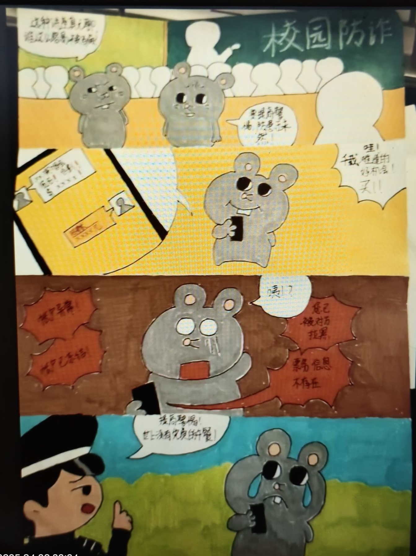 2024级4班李艳芳同学的作品是一组四格漫画。以卡通形象小老鼠为主角,搭配警察形象,色彩鲜明。通过对话框展现人物语言,红底白字突出诈骗后果,不同底色区分情节阶段。以故事化形式讲述小老鼠从忽视防诈到遭遇诈骗的过程,生动展示诈骗套路,助力同学们增强防骗意识。