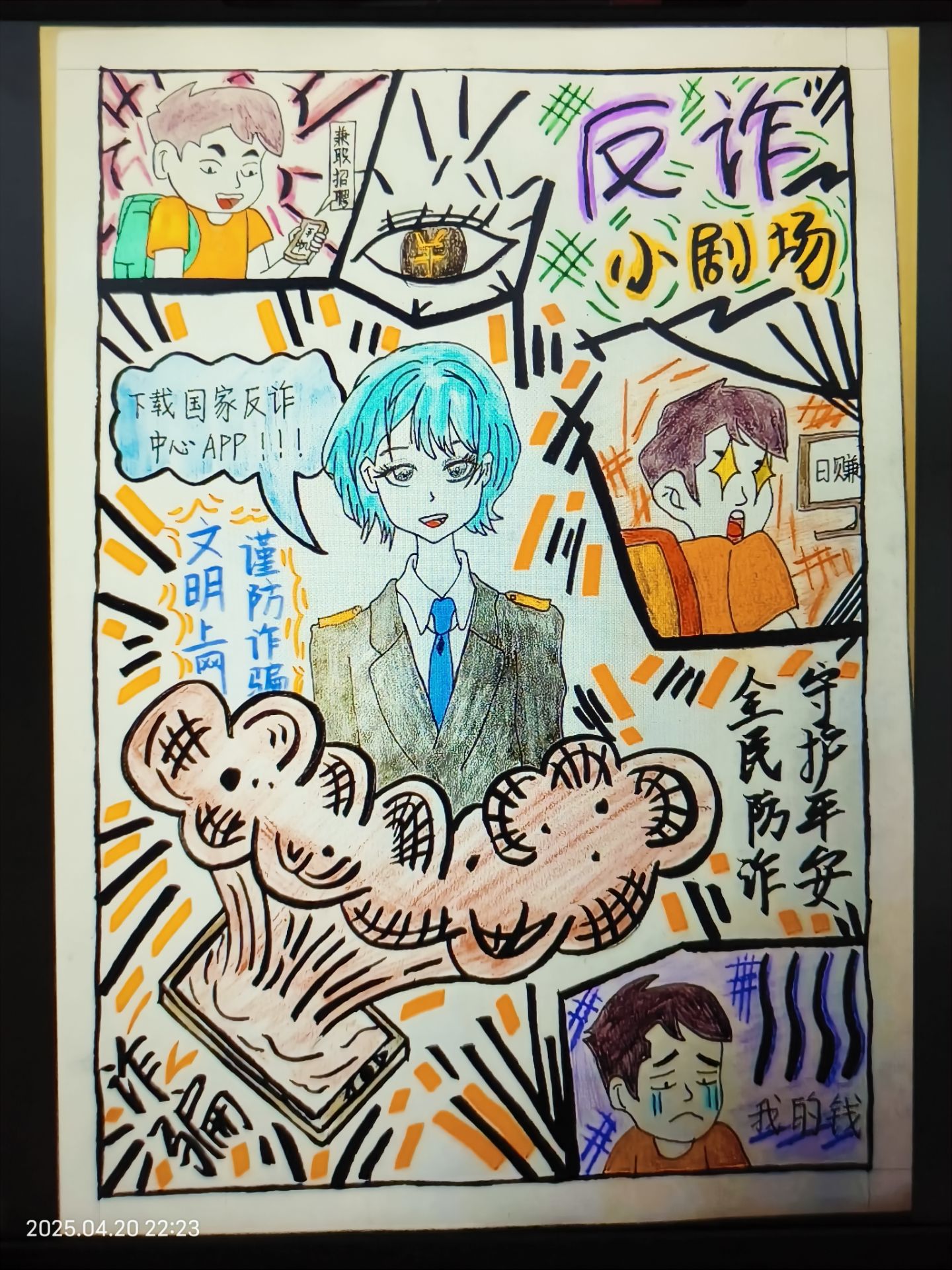 2024级2班王雪同学的作品构建了“反诈小剧场”。画面中,背着书包的大学生代表易受骗群体,穿制服人物象征反诈宣传者;“下载国家反诈中心APP”等文字传递反诈知识;眼睛与钱币、手机触手等图案,寓意诈骗分子的贪婪和网络诈骗手段的延伸。作品通过故事化场景,展现诈骗过程与危害,呼吁大家守护财产安全。