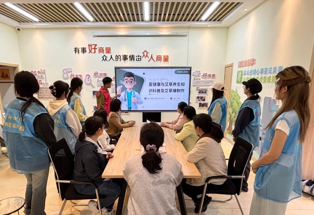 本次活动分为视频教学、知识科普和手工实践三个环节:志愿者首先播放艾草锤制作视频,带领在场人员学习测量布料尺寸、绘制裁剪模板、挑选干燥艾草、分层填充压实、锁边缝制和收口定型6步工艺,他们认真学习每一项步骤;随后,志愿者以图文并茂的形式,结合《本草纲目》等古代著名医书里对艾草的记载,呈现不同品种艾草的特征差异,并根据生活实例讲解艾草的药用价值及品种差异,解析艾灸、泡脚等实用场景,帮助女士们在日常生活中更好的使用并改善身体;最后,志愿者分组协助女士们完成艾草锤的制作,互相交流裁剪技巧、艾草填充的技巧以及艾草填充的量,避免艾草锤过满或过松,提升了他们的动手能力和协作能力,帮助他们掌握健康养生技能。