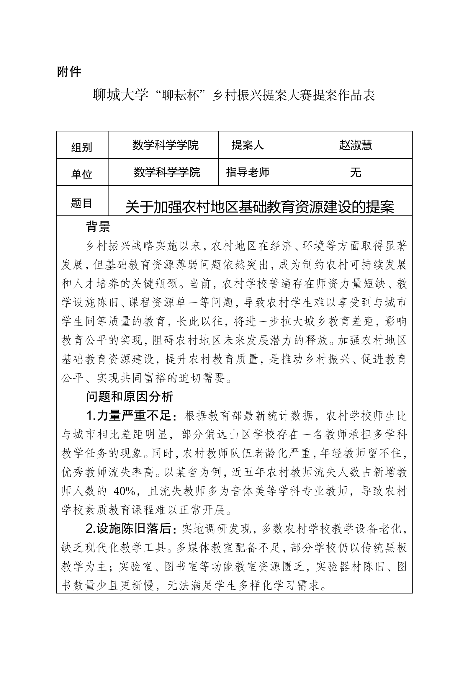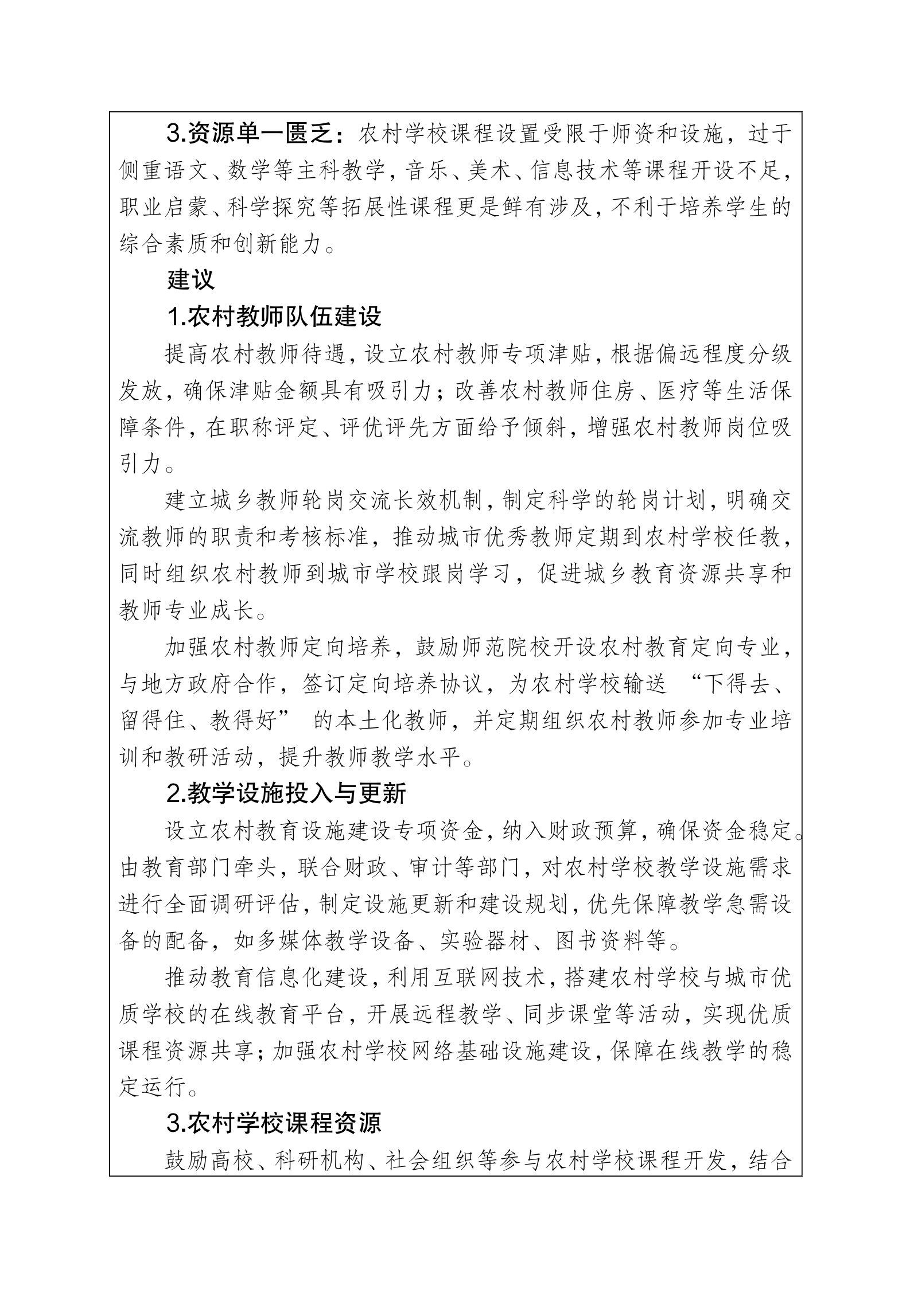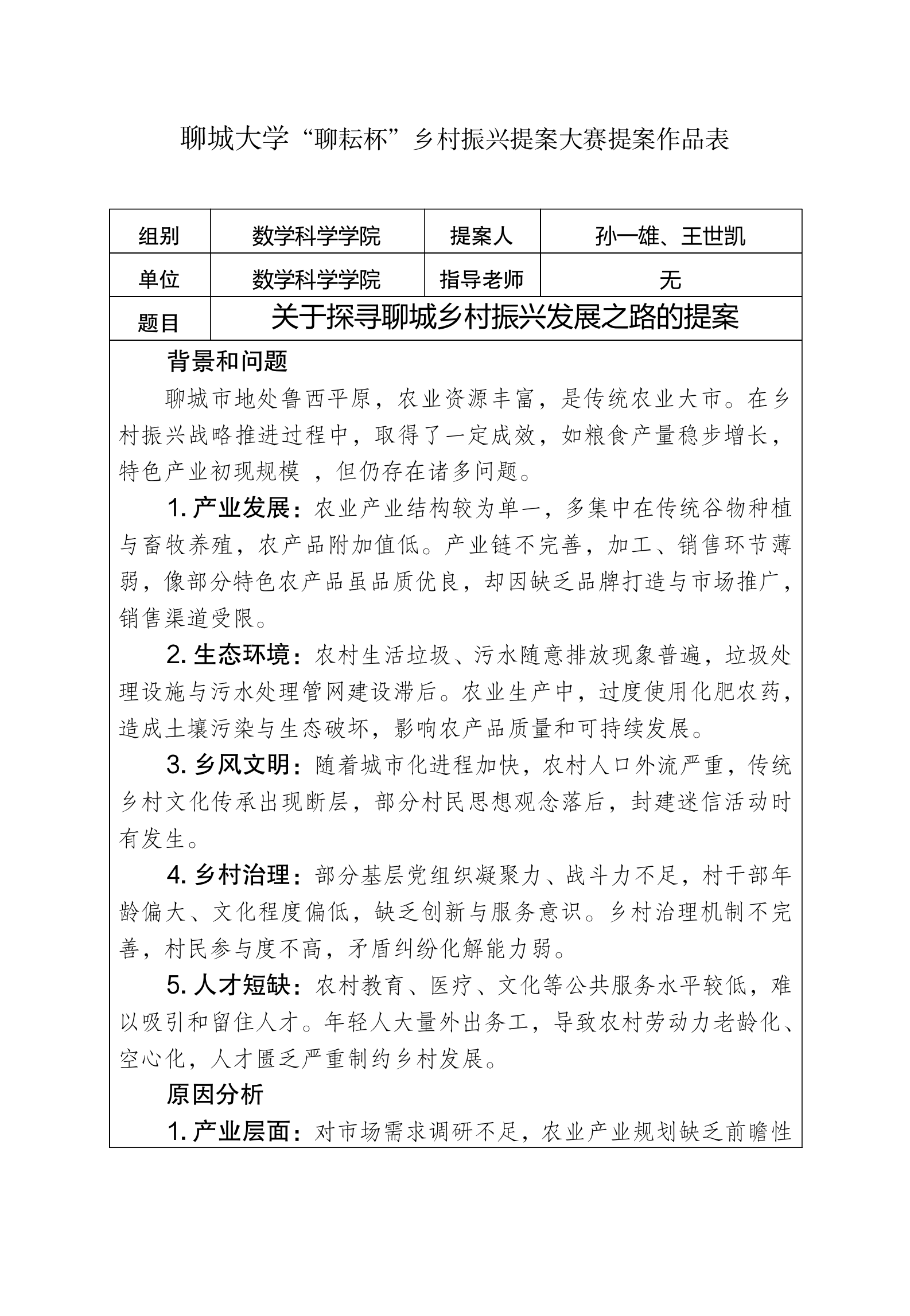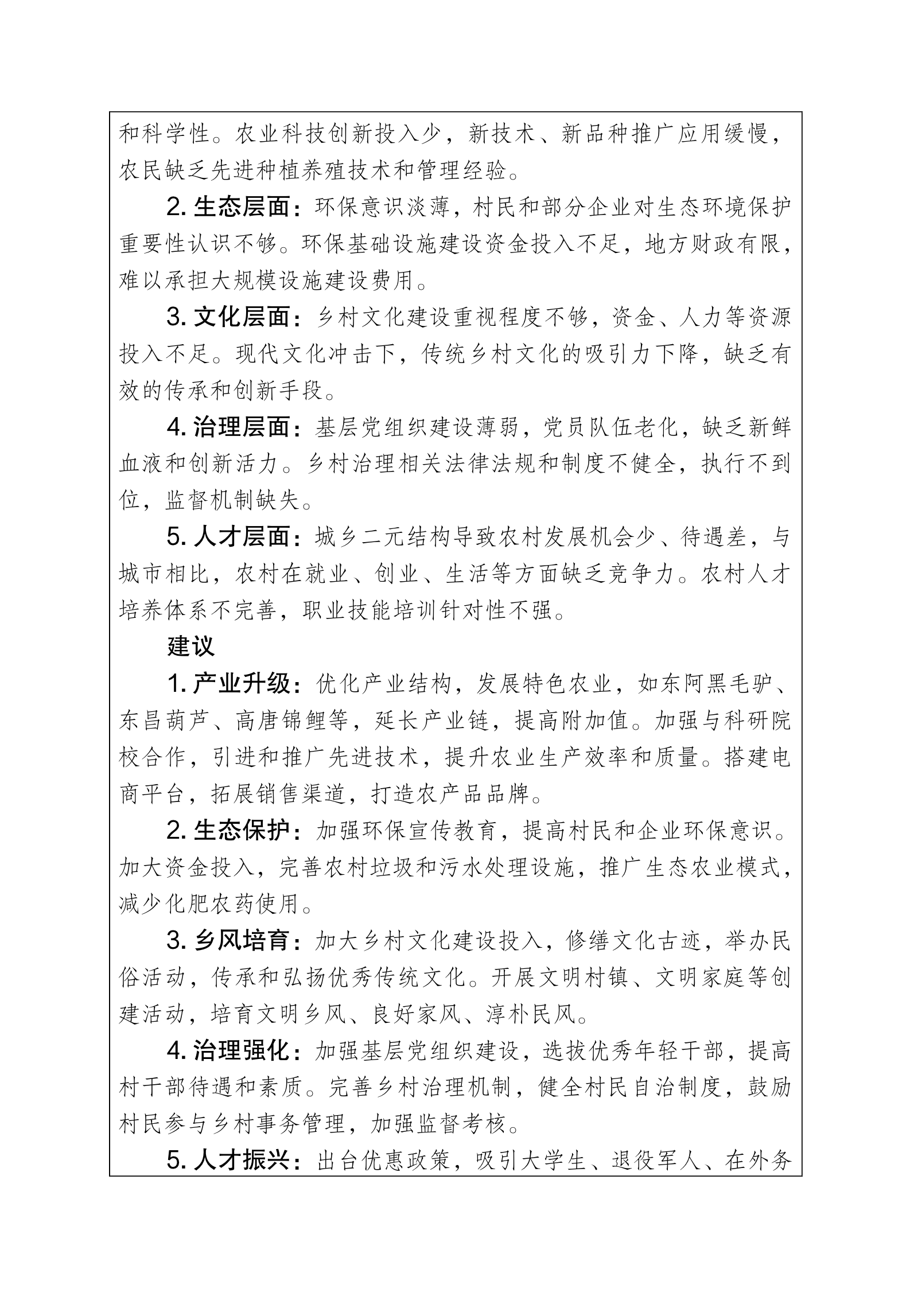 参赛学生通过问卷调查、查找资料等方式,了解乡村现状及面临的问题。在调研过程中,学生们发现聊城乡村在产业发展、人才培养、文化建设等方面存在一些亟待解决的问题:部分乡村产业结构单一,缺乏特色产业,导致经济发展缓慢;文化建设相对滞后,传统文化得不到有效传承和弘扬,乡村凝聚力不足。针对这些问题,学生经过反复讨论与思考,就农村教育资源改善、乡村生态环境治理、产业发展等方面,提出了一系列可行性建议,如开展“送课下乡”活动,增加具有乡土课程的资源;优化产业结构,加强生态环保,加大乡村文化建设投入,加强人才振兴。