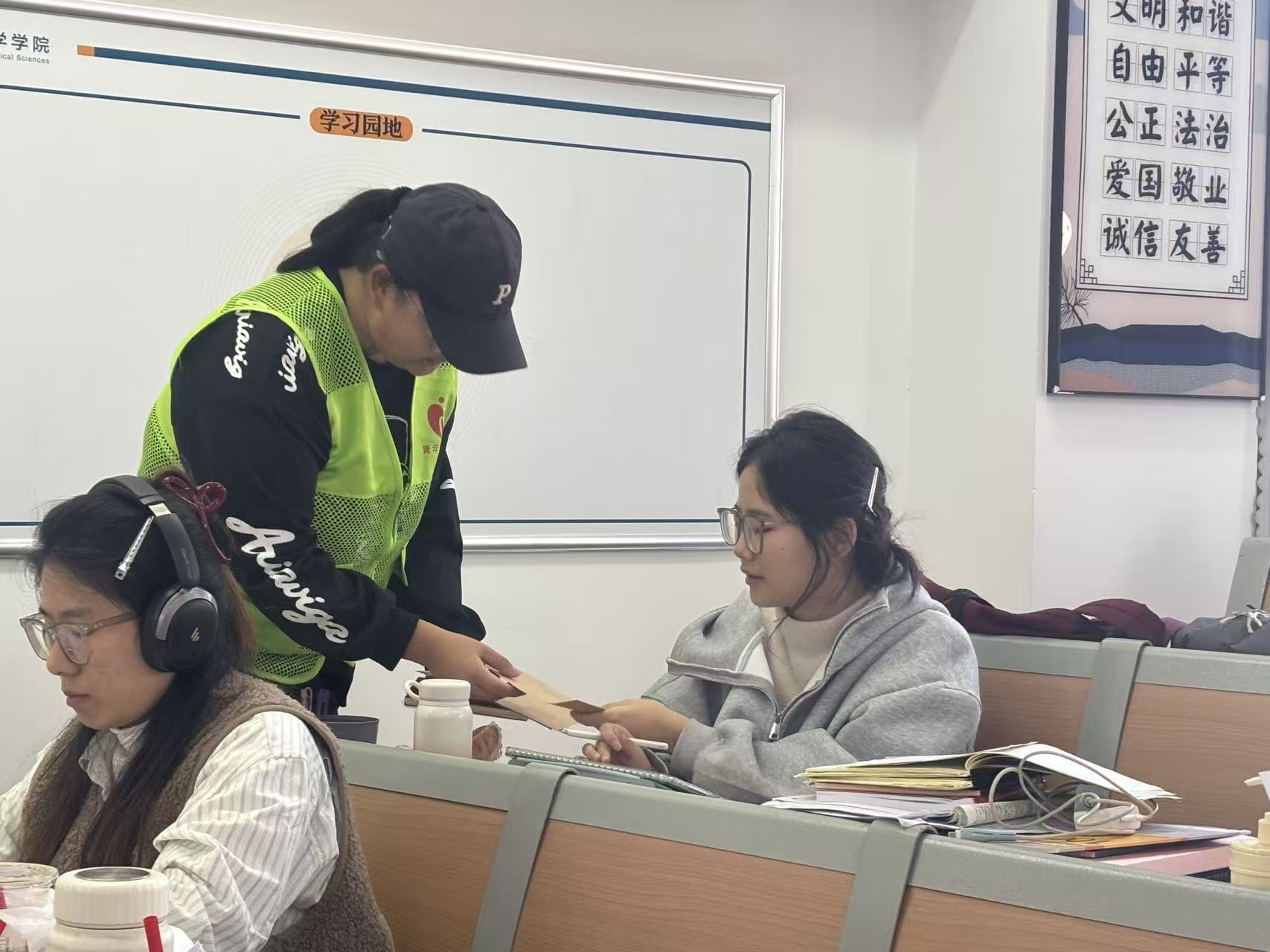 活动当天,志愿者们将同学们的祝福信封、手绘图画,一一收集打包成“备考能量包”,让牵挂和祝福都稳稳就绪。随后,志愿者们来到考研教室,将充满心意的“能量包”递到学长学姐手中,他们关切地询问学长学姐的身心状态,鼓励大家要不畏备考途中的艰难险阻,以饱满状态全力奔赴梦想。接过礼物的学长学姐们脸上洋溢着幸福与感动,言语间满是对这份心意的感激,他们表示要把这份温暖转化为备考的动力,以更饱满的状态投入后续复习,不负大家的期待与祝福,努力发挥出自己的最佳水平,取得理想的成绩。