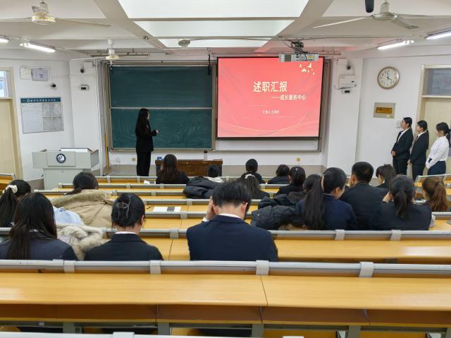 首先,各部门主要负责人依次进行述职汇报,以PPT的形式系统总结部门的工作概况与工作成果,并对本学期部门开展的工作进行反思与总结,针对性地提出下一阶段的工作设想。随后,评委们结合各部门的述职内容展开细致点评与针对性提问,既肯定了各部门在本学期工作中的努力付出与显著成效,也精准指出工作中有待完善的细节,为各部门优化工作方法、提升工作质量提供切实可行的指导。最后,评委老师在总结发言中强调,学生组织作为连接学院与学生的桥梁纽带,要始终坚守“全心全意为同学服务”的宗旨,既要立足本职工作,及时传递学生诉求,也要主动担当作为,不断提升组织的凝聚力与执行力,真正成为学院信赖、同学满意的得力助手。