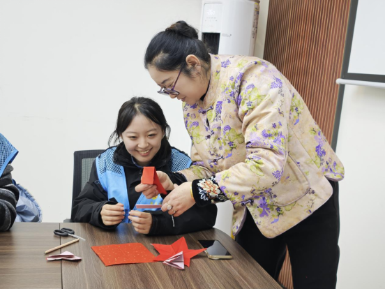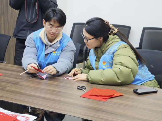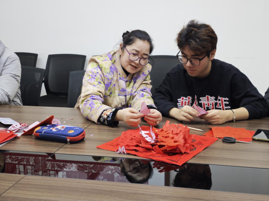在实践体验环节,剪纸非遗传承人尹爱群老师现场授课,细致演示了剪纸的核心技法。队员们结合专业特色,完成了“福”字窗花、生肖图案及数学符号主题作品,让传统艺术与数学思维碰撞出独特火花。活动最后,队员们对尹老师进行采访,聆听她因热爱而坚守的传承故事,并围绕剪纸与红色文化的融合、创新传播展开探讨,提出青年视角的可行建议。