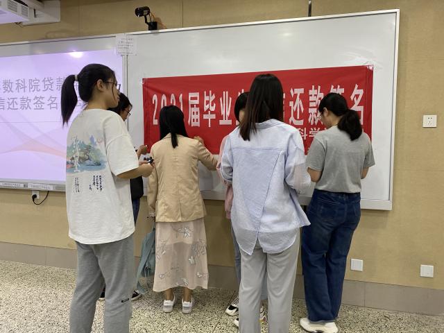 为使同学们充分认识诚信的重要性,引导同学们诚信做人,诚信做事,按时偿还助学贷款本息,保证国家助学贷款的有效循环,数学科学学院于5月6日在西校11教学楼A304教室开展贷款毕业生诚信报告会和诚信还款签名活动,2021届申请助学贷款的毕业生参与本次活动。