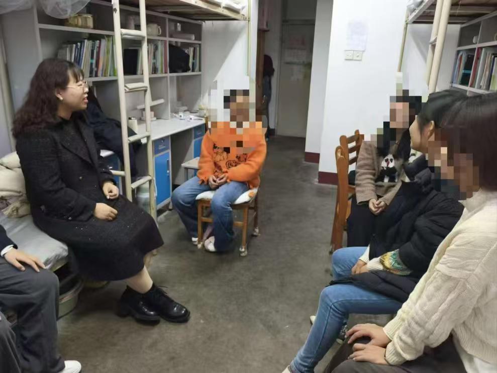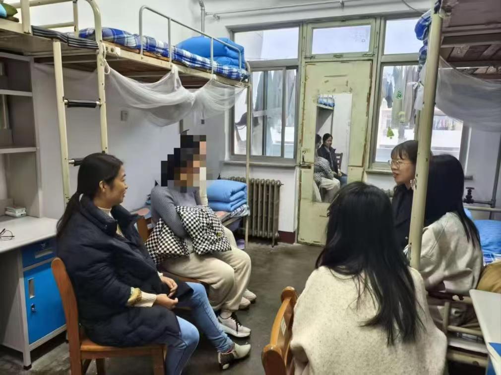 访谈过程中,老师们与学生们亲切交流,详细询问了她们的学习情况、生活费用来源以及面临的实际困难。在了解到部分学生因经济压力产生的学业困扰后,学院老师鼓励学生积极利用学校助学金政策与勤工俭学机会解决困难,同时为学生提供了一些学业规划与心理调适的建议。