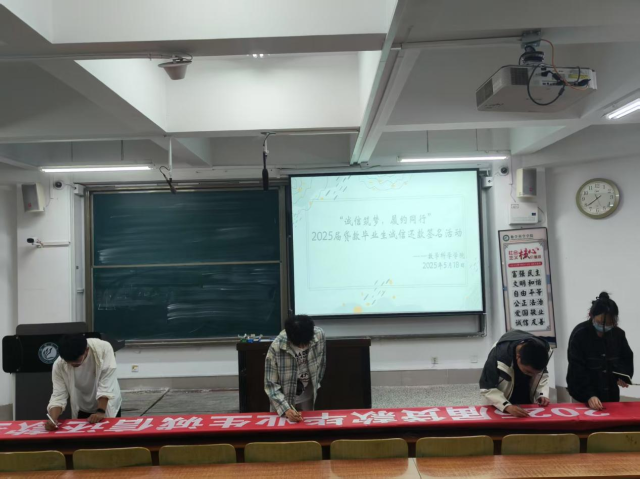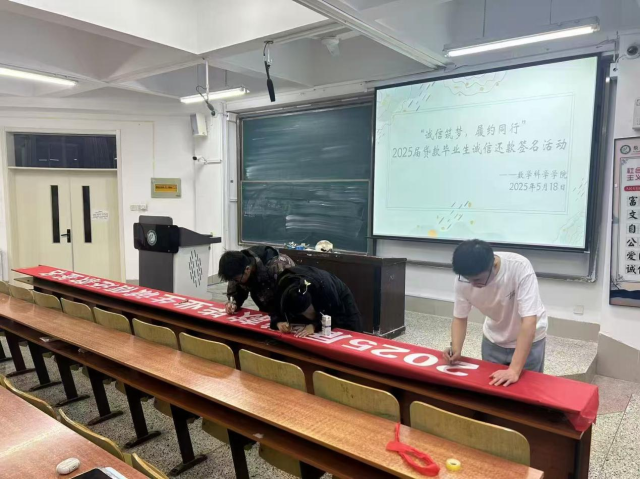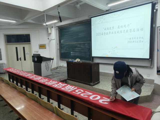 5月18日,数学科学学院在 A107教室开展2025 届贷款毕业生诚信还款签名活动,2025 届全体贷款毕业生积极参与其中。本次活动以 “诚信筑梦,履约同行” 为主题,旨在强化贷款毕业生的诚信意识,引导他们树立正确的信用观念,切实履行还款义务。