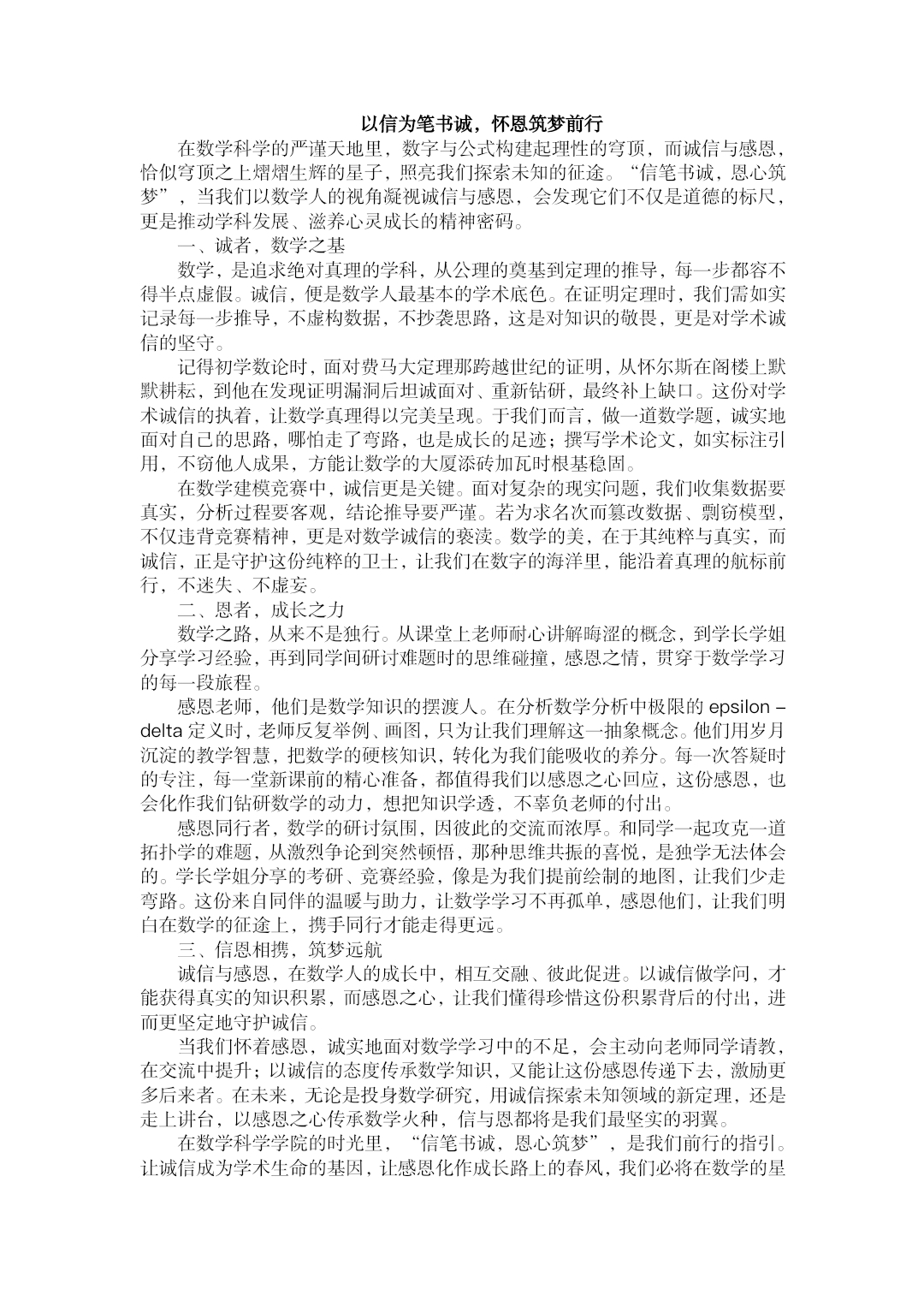 为引导学生表达感恩,树立诚信意识,6月7日至9日,数学科学学院举办了“信笔书诚,恩心筑梦”诚信感恩主题征文活动,2023级、2024级部分学生参加。