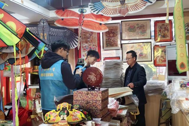 实践队走进恒兴义木板年画工坊,观摩杨家埠木板年画制作过程,工坊负责人杨文兴凭借丰富的理论知识与创作经验为实践队讲解了木版年画的规模化制作。随后,团队成员体验制作年画,领悟木版年画深处的传统魅力。在此期间,团队还为工坊年画产品提出创新性建议,希望为非遗文化传承注入青年力量。