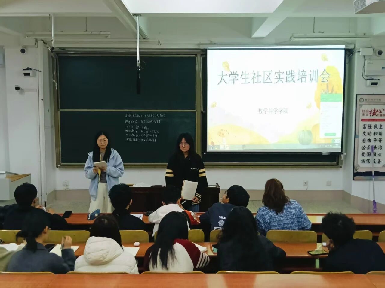 为增强学生对社区实践的认识,提高学生参与社区实践的积极性和主动性,10月18日,数学科学学院于11号教学楼A104教室开展大学生社区实践培训会,本次活动由创新实践部翟恒瑶、青年志愿团王付堃主持,2025级班长、团支书参加。