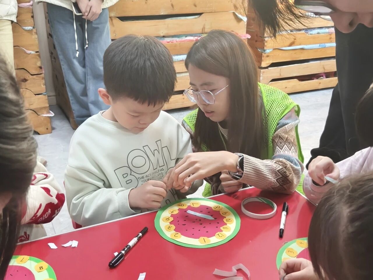活动伊始,志愿者以“时间的故事”为主线,带领孩子们开启跨越千年的计时科技探索之旅。从古代丈量时光的日晷、沙漏,到精准计时的机械钟表,再到便捷高效的手机计时工具,志愿者用生动形象的语言向孩子们细致讲解不同计时工具的发展历程与原理,将抽象的时间概念转化为直观认知,深入浅出解锁时光里的科技奥秘,充分激发孩子们的探索兴趣。手工实践环节,志愿者为小朋友们分发提前准备好的简易时钟手工材料包,耐心示范剪纸、粘贴、组装等步骤,手把手指导孩子们动手操作。孩子们兴致盎然投入创作,认真裁剪部件、细心拼接组装,逐步完成简易时钟制作。当看到自己制作的时钟指针顺利转动,孩子们脸上洋溢着满满的成就感,在感受手工乐趣的同时,直观体会数字与刻度的对应逻辑,悄然建立对数学之美的初步认知,在“看、听、做、玩”的多元体验中感知时代更迭与科技进步的魅力。