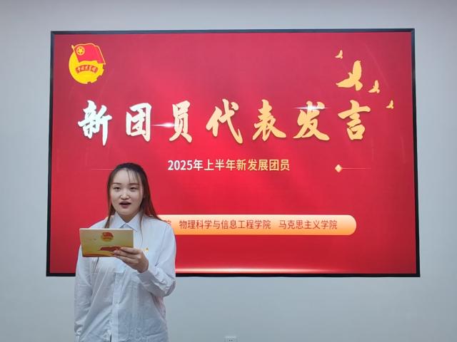 物理科学与信息工程学院团委书记洪文静向新发展团员致以热烈祝贺,并提出以下三点要求:一要坚定理想信念,把稳政治方向,以实际行动践行入团誓词;二要强化使命担当,发扬“功成不必在我,功成必定有我”精神,为学校和学院建设贡献青春力量;三要锤炼过硬本领,主动担当作为,发挥模范带头作用,积极服务同学。她期望新发展团员以信念为帆、以担当为桨、以能力为翼,在青春赛道上奋力书写时代答卷。