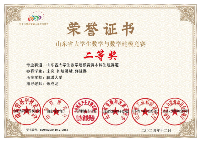 “不积跬步,无以至千里;不积小流,无以成江海。”宋奕始终秉持勤学笃行的精神,以扎实的学风和坚韧的毅力在学业道路上不断攀登,学分绩点与综测成绩稳居专业榜首,曾获山东省优秀学生、国家奖学金、校长奖学金等荣誉。在专业学习之外,她积极培养创新思维与实践能力,先后斩获“建行杯”第九届山东省“互联网+”大学生创新创业大赛省赛银奖、第十八届iCAN大学生创新创业大赛三等奖、山东省大学生数学建模竞赛二等奖等重要奖项,并在海角 “润育梦想”创新创业就业训练营中获评优秀营员。