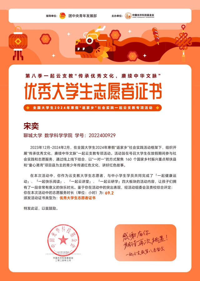 “纸上得来终觉浅,绝知此事要躬行。”作为班长,宋奕以真诚待人、以实干服人,既是师生沟通的坚实桥梁,又是班级建设的核心力量。担任主席团成员期间,她以高度的责任感统筹协调工作,精心打造系列精品活动,为学院文化建设注入蓬勃活力。在社会实践领域,她所在的“三下乡”团队获评海角 优秀服务团队,并先后荣获天天有益社会创新中心“优秀志愿者”、“一起云支教”优秀大学生志愿者等称号,让青春在服务他人、奉献社会中绽放绚丽光彩。