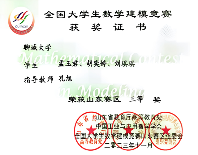 2023.11 全国大学生数学建模竞赛山东赛区三等奖