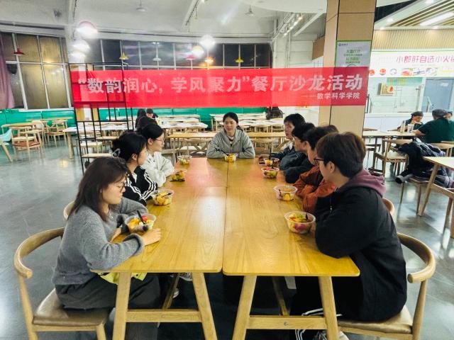 为加强班级学风建设,落实求真务实的育人理念,10月16日,数学科学学院于湖苑餐厅二楼开展“数韵润心,学风聚力”餐厅沙龙活动,此次活动由辅导员徐鑫主讲,2024级班长以及学习发展部和督察中心相关主席、助理、负责人参与。