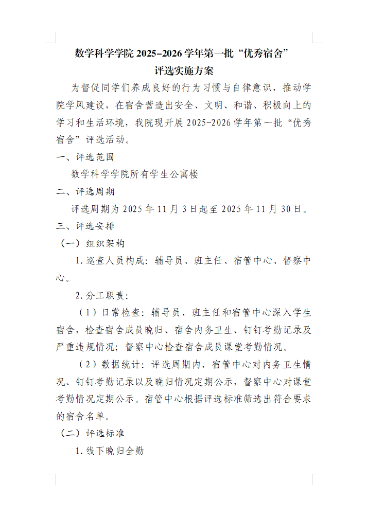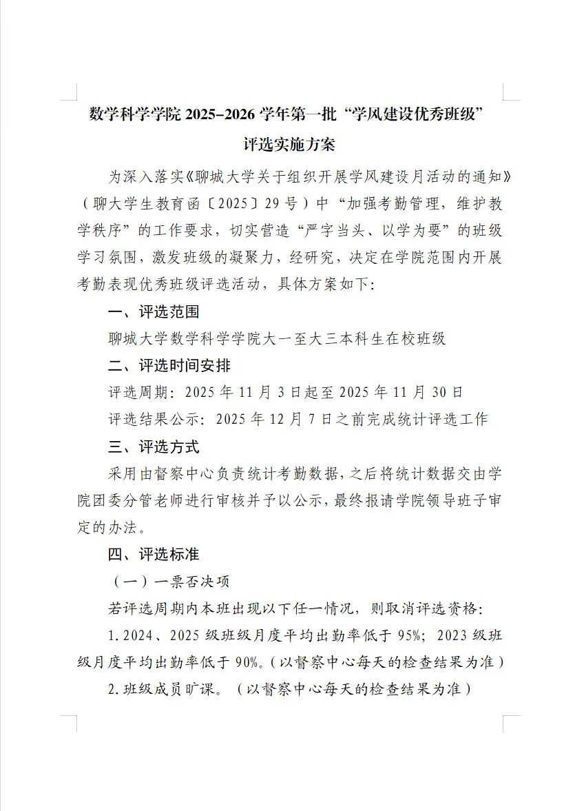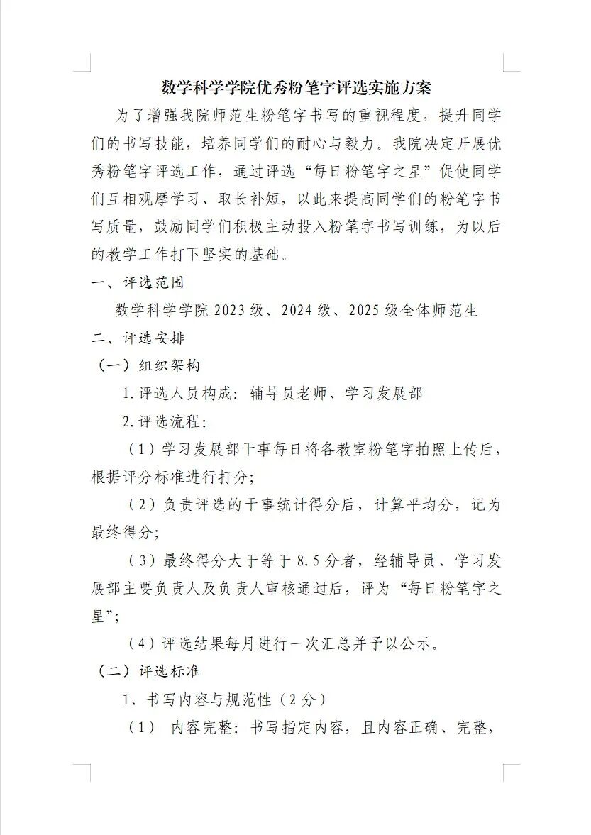 学院出台《数学科学学院“学风建设优秀班级”评选实施方案》《数学科学学院“优秀宿舍”评选实施方案》《数学科学学院优秀粉笔字评选实施方案》等制度,将评选结果纳入学生综合测评体系;将研究生学术规范考核纳入常规,坚持学术不端“零容忍”,构建“学业 + 科研 + 日常”综合测评体系,形成“规范保障创新、创新关联激励”的机制。