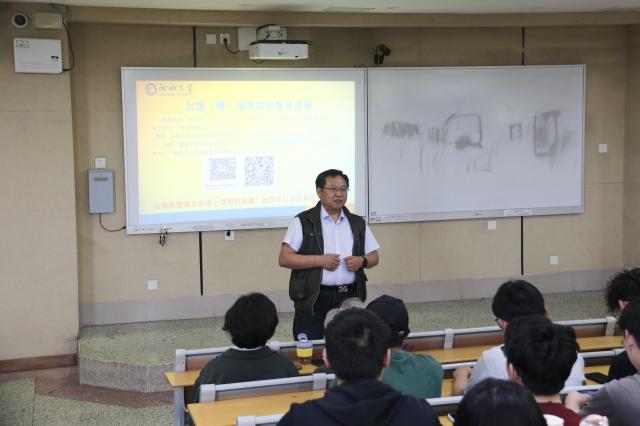 为帮助学生深入了解留学信息,规划未来的学术道路,4月23日,数学科学学院于11号教学楼C304教室举办2025年学生出国留学项目宣讲会,国际交流合作处副处长钱润池出席活动并讲话,张素嫣、王影担任主讲人。