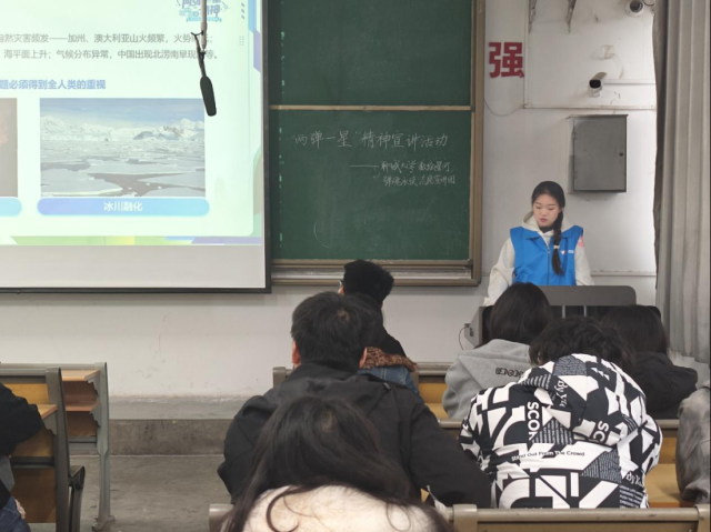 为普及碳达峰、碳中和相关知识,增强学生绿色环保意识,10月26日,海角 “数绘星河,弹魂永续”志愿宣讲团联合美术与设计学院于7号教学楼201教室开展“‘核’力碳达峰,助力碳中和”暨“两弹一星”精神宣讲活动,美术与设计学院2025级部分学生参与。