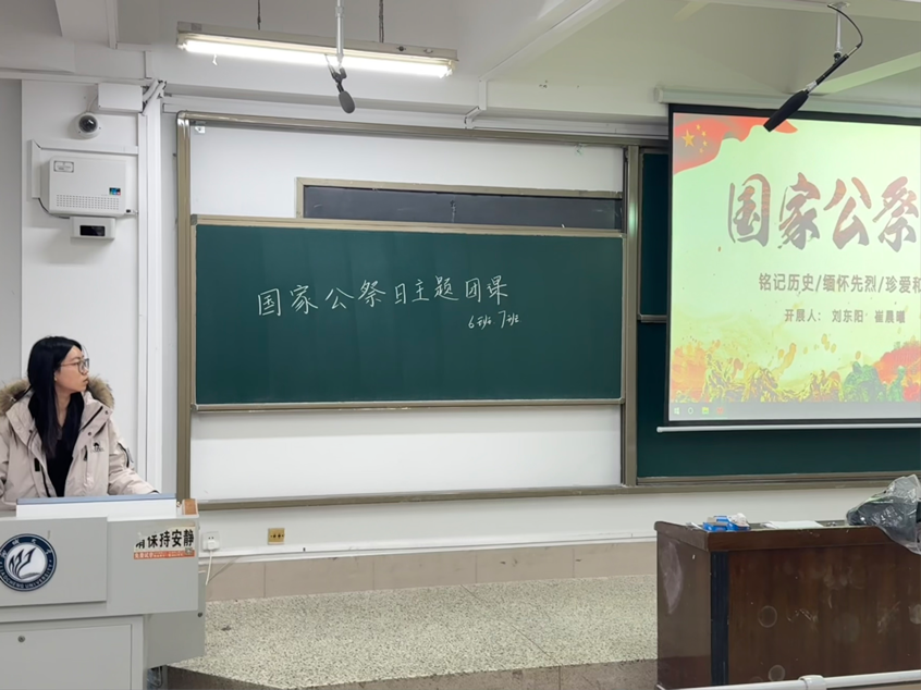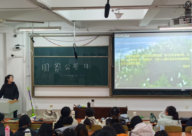 数学科学学院2023级1班于A104教室开展“勿忘国耻,振兴中华”国家公祭日主题团日活动,本次活动由团支书姚雨彤主持。活动伊始,团支书详细介绍国家公祭日的由来和意义,表明中国人民反对侵略战争、捍卫人类尊严、维护世界和平的坚定立场。随后,全班学生共同观看关于国家公祭日的相关视频和资料,一幕幕触目惊心的画面,让同学们深刻感受到战争的残酷和侵略者的残暴。活动最后,团支书引用习近平总书记的话作为结语:“历史告诉我们,和平是需要争取的,和平是需要维护的。”这句话深深触动在场每一位同学的心弦,大家表示要牢记历史使命,珍惜和平时光,为实现中华民族伟大复兴贡献青春力量。