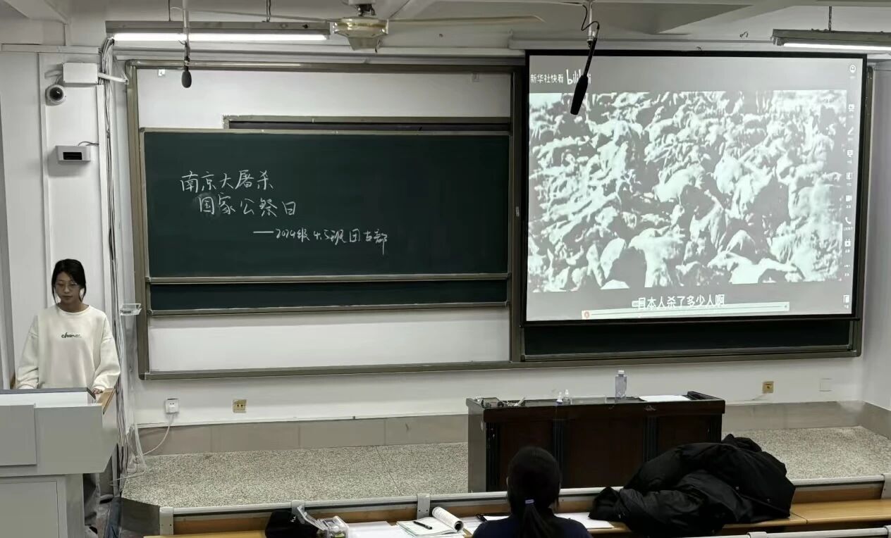 数学科学学院2024级4班于11号教学楼A204教室开展“勿忘国耻,振兴中华”国家公祭日主题团日活动,由团支书孙若琪主持。团课伊始,全场肃穆默哀一分钟,向遇难的30余万同胞致以沉痛哀悼,气氛凝重悲怆。随后,以影像资料深度还原那段惨绝人寰的历史:日军暴行下,南京城生灵涂炭、哀鸿遍野,血腥场景震撼着在场每一位同学的心灵,侵略者的罪恶铁证如山,不容置疑与忘却。活动尾声,学生宣誓,誓言铿锵有力,“勿忘国耻,振兴中华”的呼声响彻教室,彰显出青年群体捍卫历史真相、勇担时代使命的坚定决心。此次团课强化了学生对国家公祭日的认知,激励莘莘学子将悲愤化作前行力量,为中华民族伟大复兴矢志拼搏。