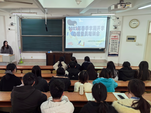 3月6日,数学科学学院在11号教学楼A104教室举办心理委员培训会,旨在提升班级心理委员的专业素养,使其更好履行班级心理委员职能。本次活动由辅导员范海燕主持,学院本科生及研究生心理委员参加。